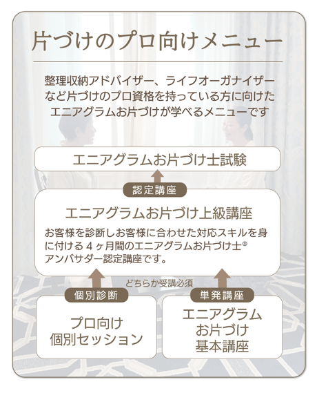 そんな中でエニアグラムに出会ってアンバサダーとして1年間学んだら、もっと深堀りしたくなったんです。また、自分が片付けのプロとして行く時に、私の周りの他のお片付けのプロの方達も、エニアグラムを知っておいた方がいいのにな、とずっと思っていたんです。